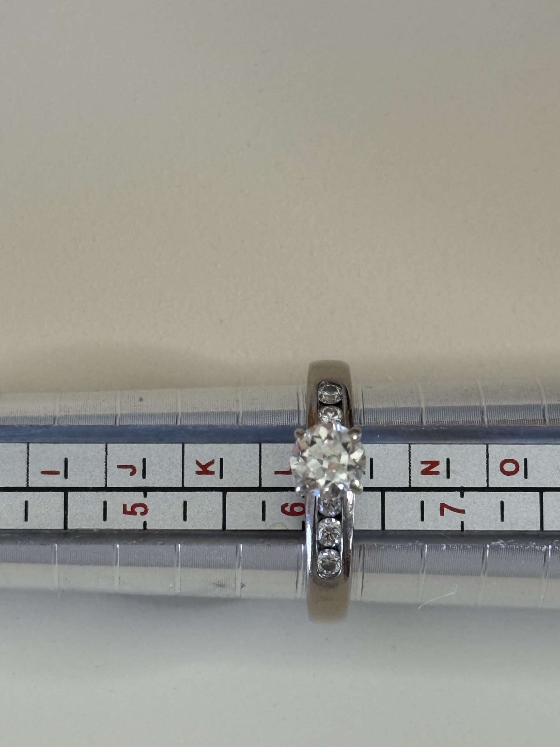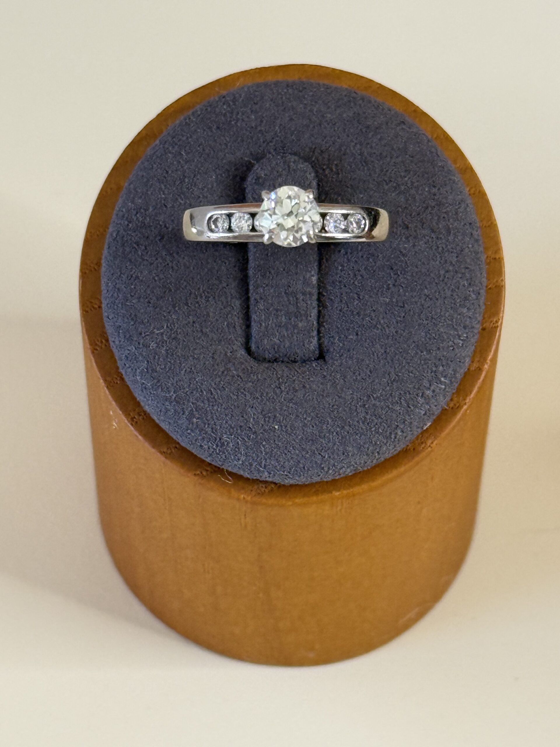 Featuring an antique traditional cut center diamond weighing approximately 0.60–0.72 carats. The diamond faces up beautifully white and lively, likely in the I–J color range with SI1 clarity (eye clean).
