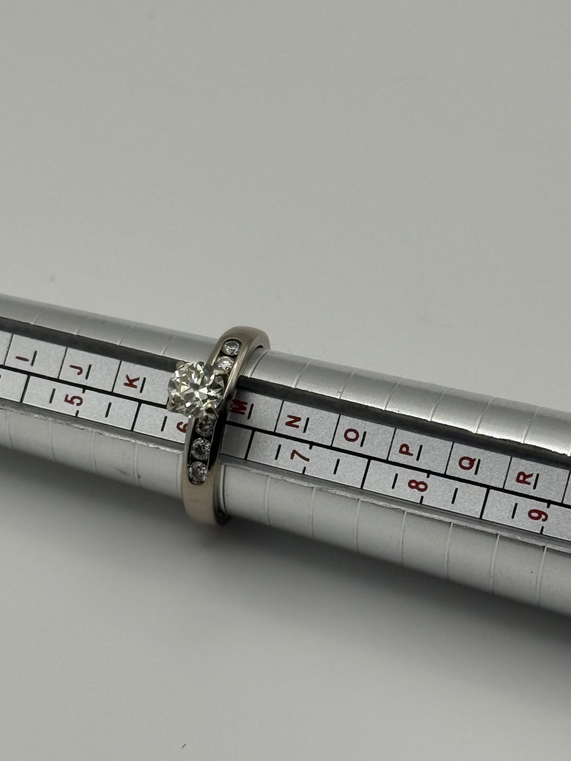 Currently size 12 and can be sized down with professional resizing and refinishing available through Diamocycle.